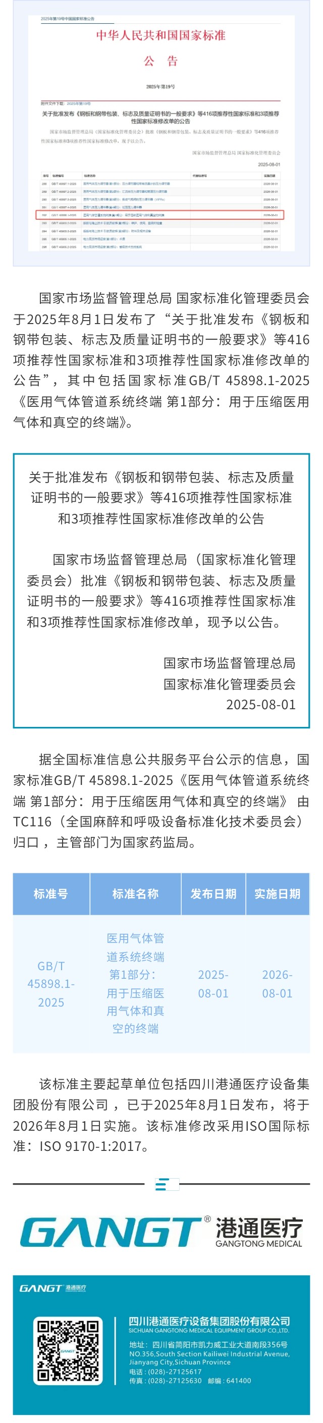 国家标准GB/T 45898.1-2025《医用气体管道系统终端 第1部分:用于压缩医用气体和真空的终端》已正式发布